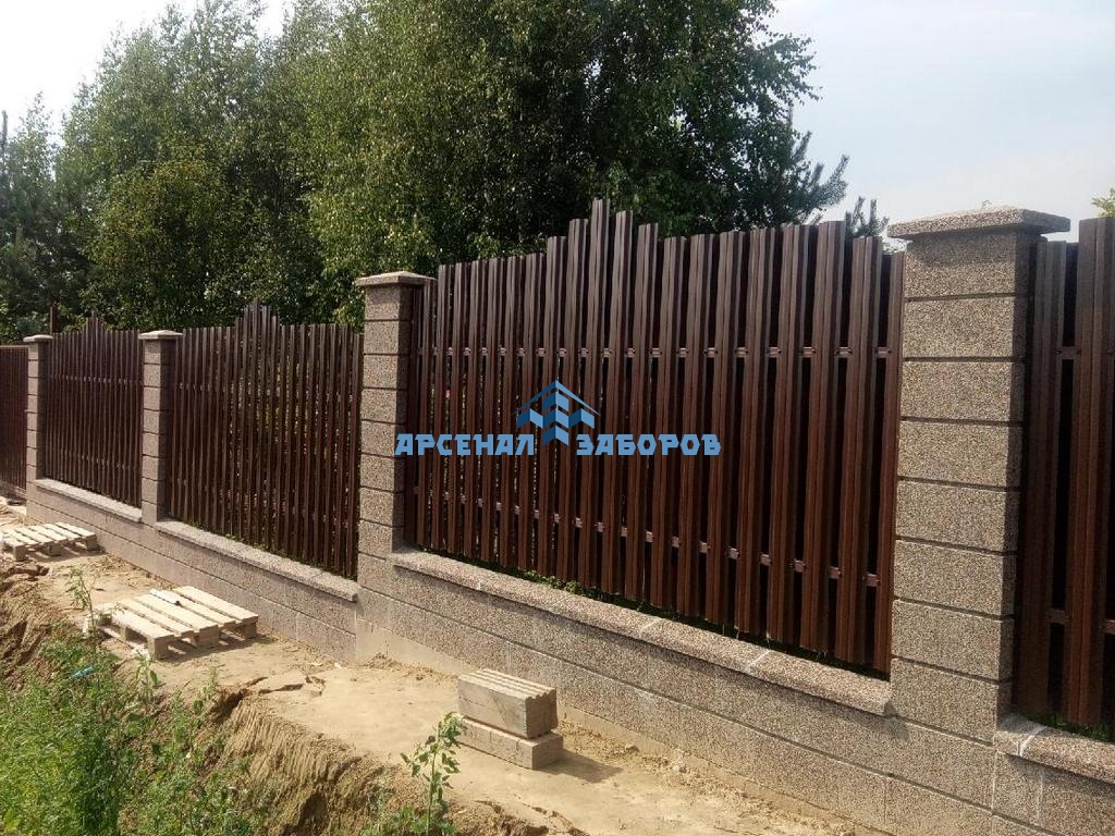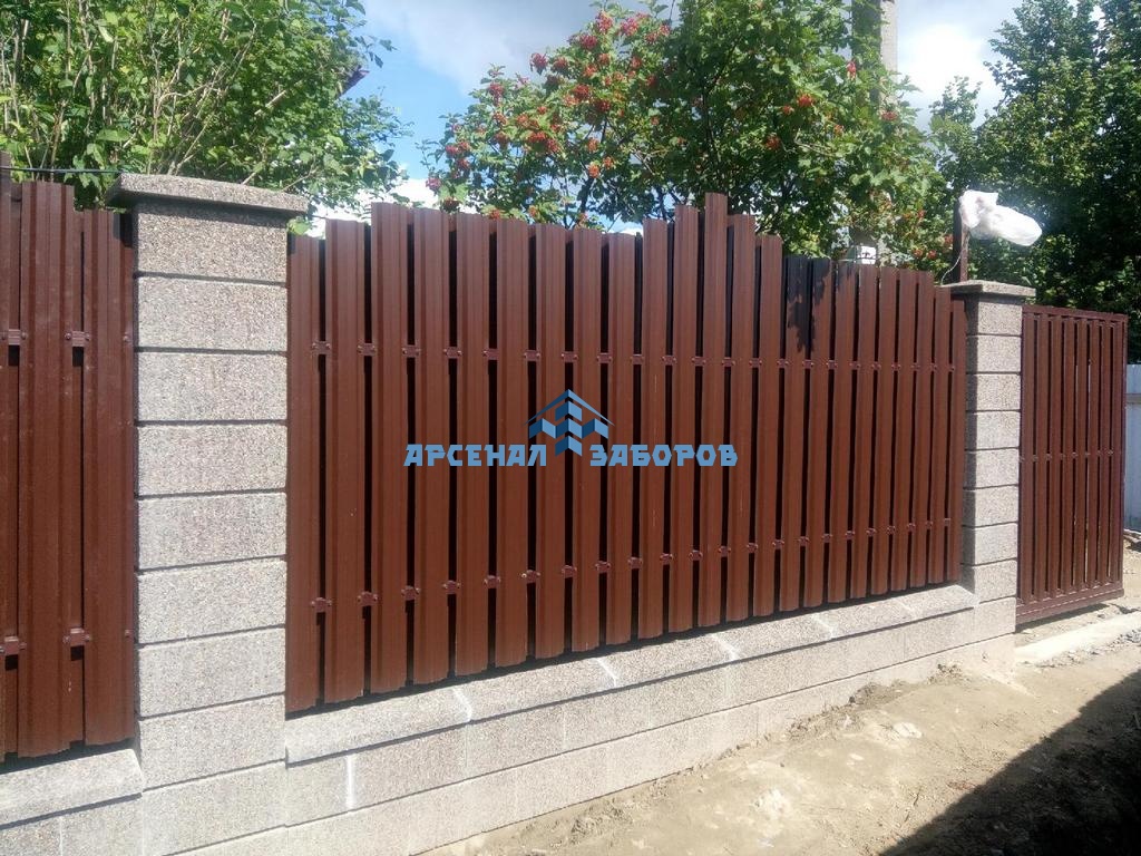 Забор из евроштакетника с кирпичными столбами