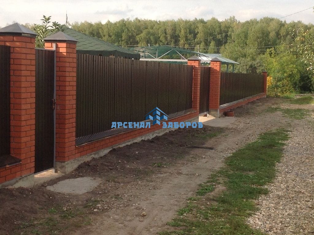 Конструкция забора из профлиста на ленточном фундаменте и с кирпичными столбами