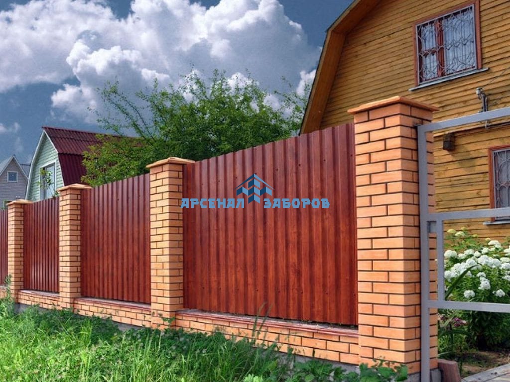 Конструкция забора из профлиста на ленточном фундаменте и с кирпичными столбами