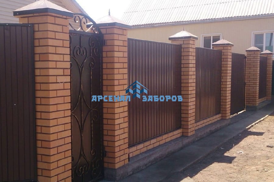 Конструкция забора из профлиста на ленточном фундаменте и с кирпичными столбами