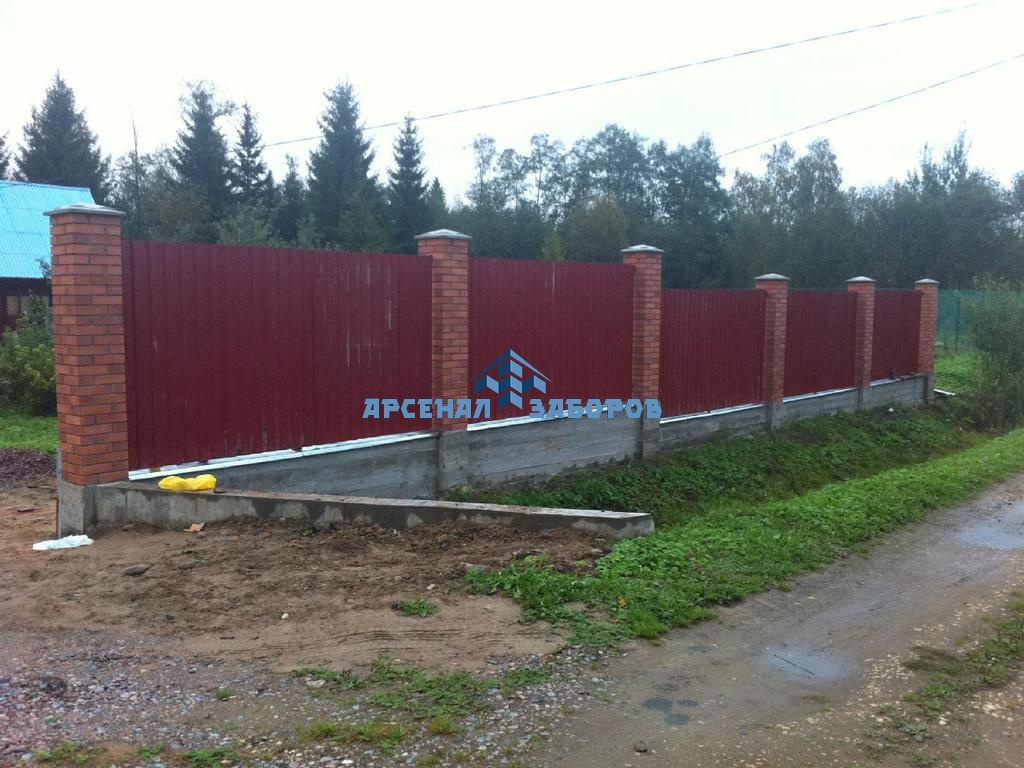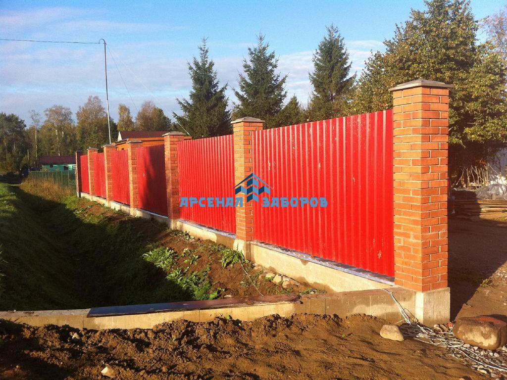 Конструкция забора из профлиста на ленточном фундаменте и с кирпичными столбами