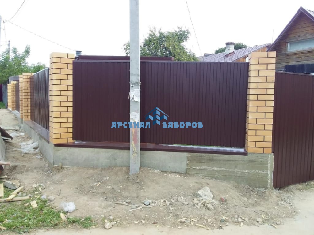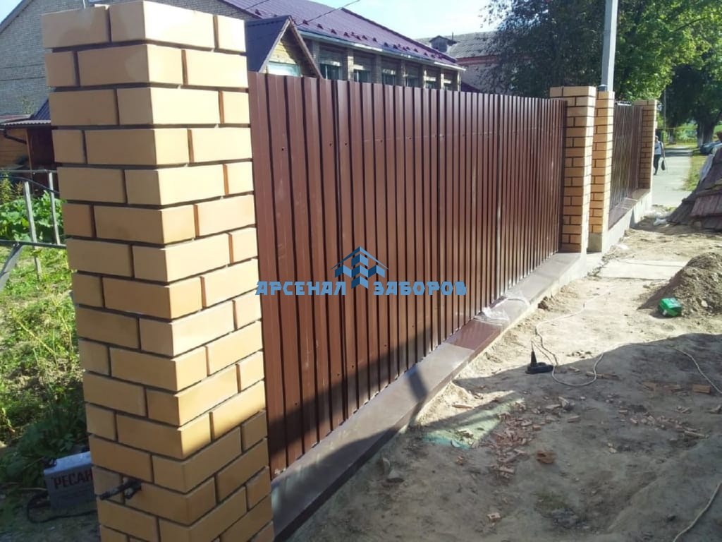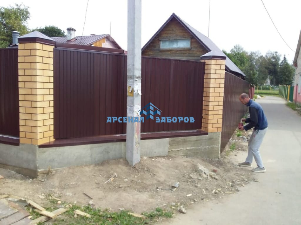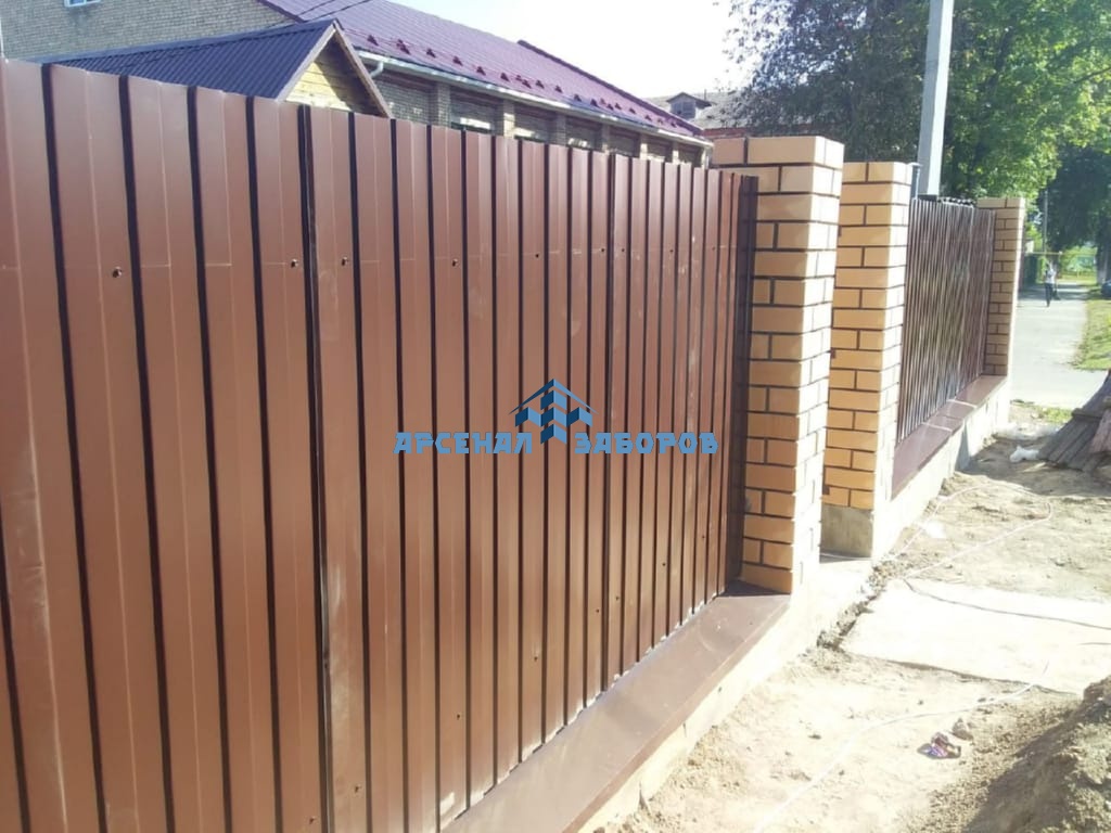 Конструкция забора из профлиста на ленточном фундаменте и с кирпичными столбами