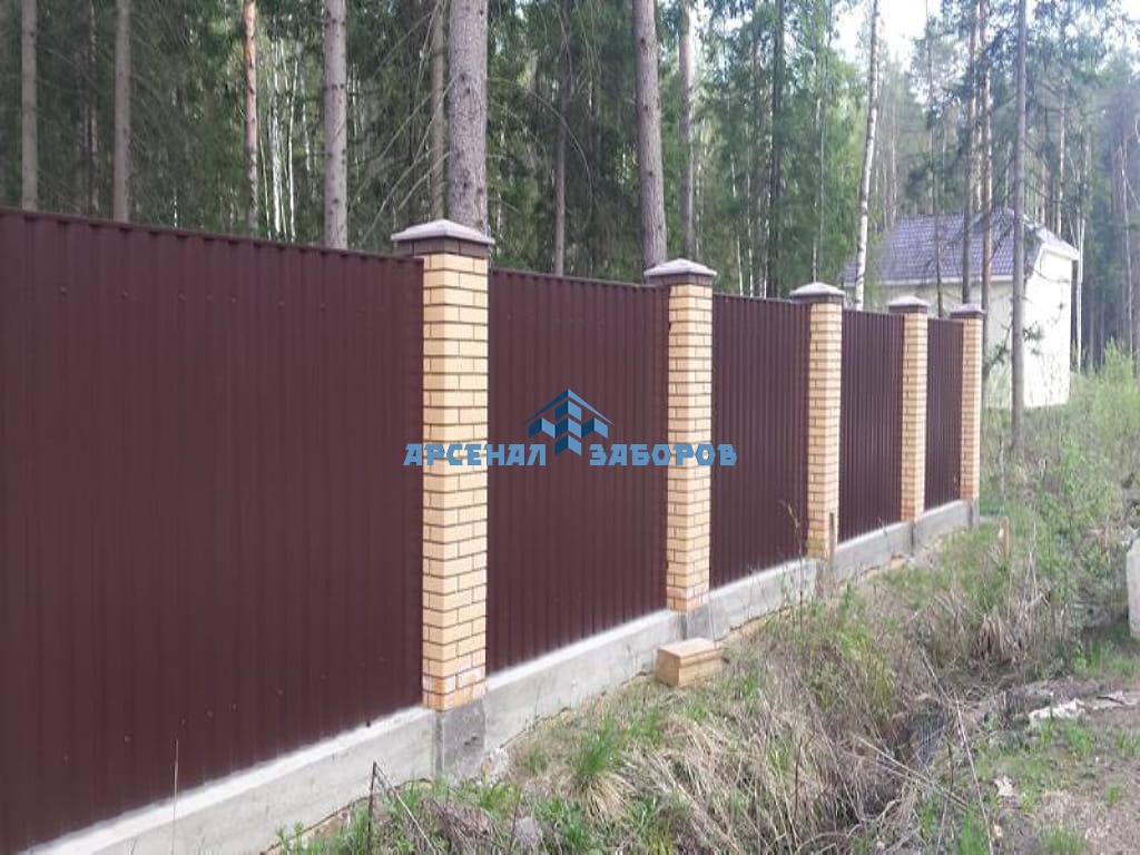 Конструкция забора из профлиста на ленточном фундаменте и с кирпичными столбами
